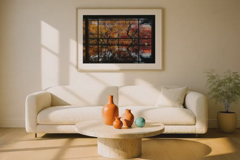 Immerse yourself in the tranquillity of Japan’s timeless gardens with this captivating artwork. The image captures a perfect harmony of golden and crimson foliage framed by traditional wooden architecture, evoking the serenity of a Japanese autumn. The rich tones of maple leaves are mirrored flawlessly in the polished wooden surface, creating a dreamlike reflection that invites a sense of calm and introspection. This print embodies the fleeting beauty of koyo (autumn leaves) and the elegance of Japanese craftsmanship, making it an exquisite addition to any art collection or interior space. Perfect for those seeking to bring a touch of nature’s artistry into their homes.