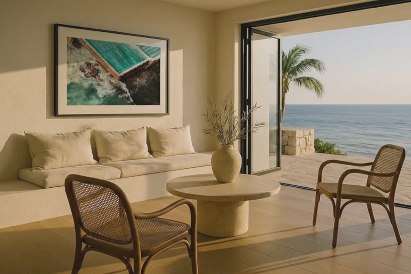 Transform your walls with a captivating aerial shot of Bondi Icebergs Rock Pool. The iconic pool, beautifully frozen in time, is lapped by crystal-clear morning waves as swimmers take a refreshing dip. The perfect addition to your home for a daily dose of inspiration and relaxation.