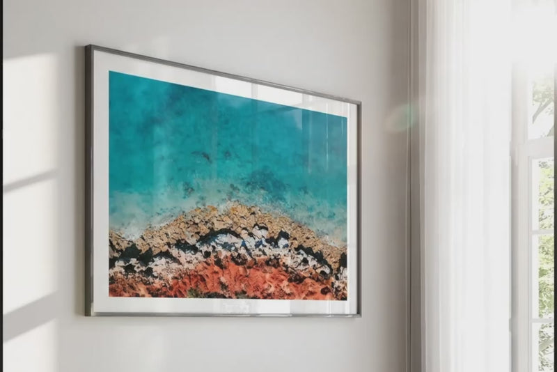 Admire the beauty of Broome's crystal blue ocean and layers of vibrant beach rocks with this unique, hand-framed print. Enjoy the originality of Australia's Western Coast with this coastal artwork! Perfect for your beach-themed home decor!