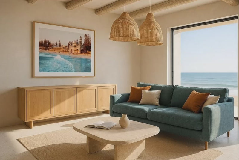 Capture the serene beauty of Cottesloe Beach with our original photography collection. This stunning print features the iconic shoreline and historic pavilion, bathed in golden light. Each hand-framed piece brings a touch of Australian coastal charm to any decor. Hand-framed and delivered free Australia-wide.