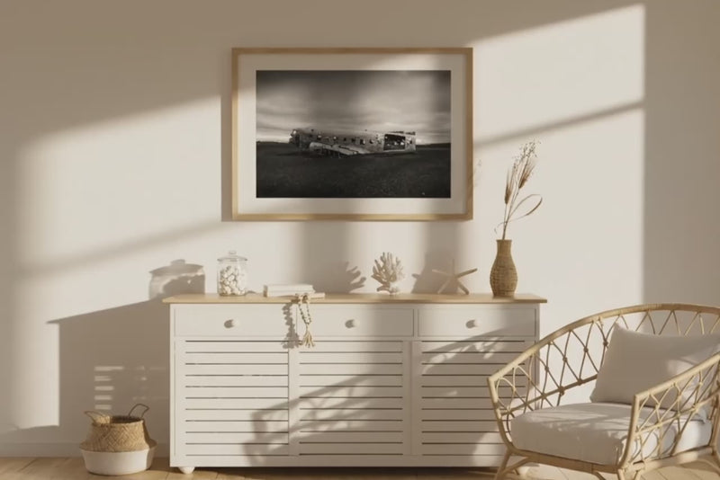 A haunting black and white capture of the famous DC-3 plane wreck on Iceland’s south coast. Set against an endless volcanic desert and dramatic skies, this striking print evokes a sense of solitude, mystery, and the raw beauty of abandonment.
