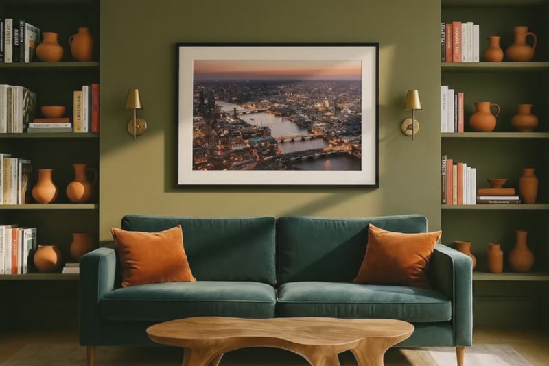 An aerial view of London captured just after sunset, showcasing the glowing cityscape as lights begin to shimmer across the River Thames. From the illuminated bridges to the iconic dome of St. Paul’s Cathedral, this piece brings together architectural Galleryur and urban rhythm. Ideal for contemporary spaces looking for a cityscape that feels alive and elegant.