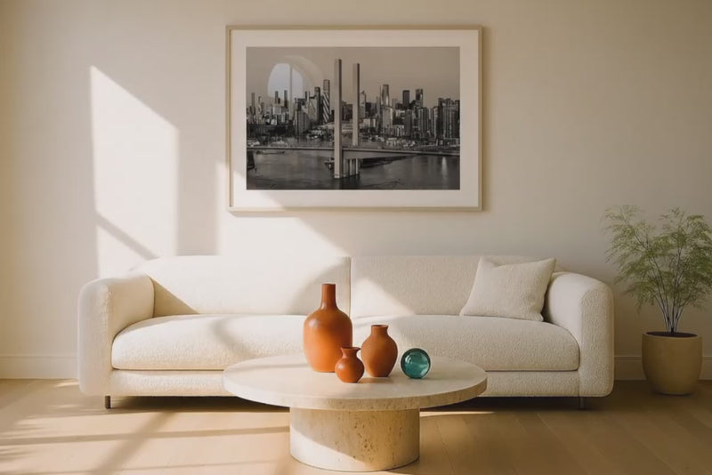 This striking black-and-white photograph captures Melbourne’s iconic Bolte Bridge standing tall against the backdrop of the city’s modern skyline. The towering pillars of the bridge frame the urban landscape, emphasising the sleek, geometric lines of Melbourne’s skyscrapers, including the distinctive architecture of Marvel Stadium. The monochrome palette enhances the contrast between the structured steel of the bridge and the dynamic, evolving skyline beyond. The stillness of the water below reflects the city’s quiet Galleryur, creating a balanced composition that highlights both the architectural and industrial beauty of Melbourne. This timeless image is ideal for lovers of modern cityscapes and those seeking to capture the essence of Melbourne’s urban elegance.