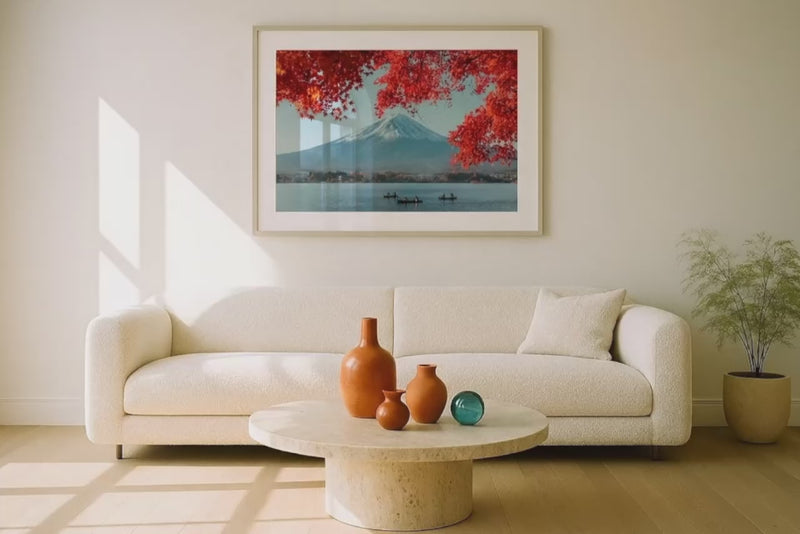This stunning artwork captures Mount Fuji’s timeless beauty, framed by vibrant red maple leaves in peak autumn splendour. The serene waters of Lake Kawaguchiko provide a tranquil setting, dotted with canoes gliding effortlessly across the surface. This breathtaking scene blends the natural harmony of Japan’s iconic mountain with the fiery colours of fall, making it a striking addition to any art collection.