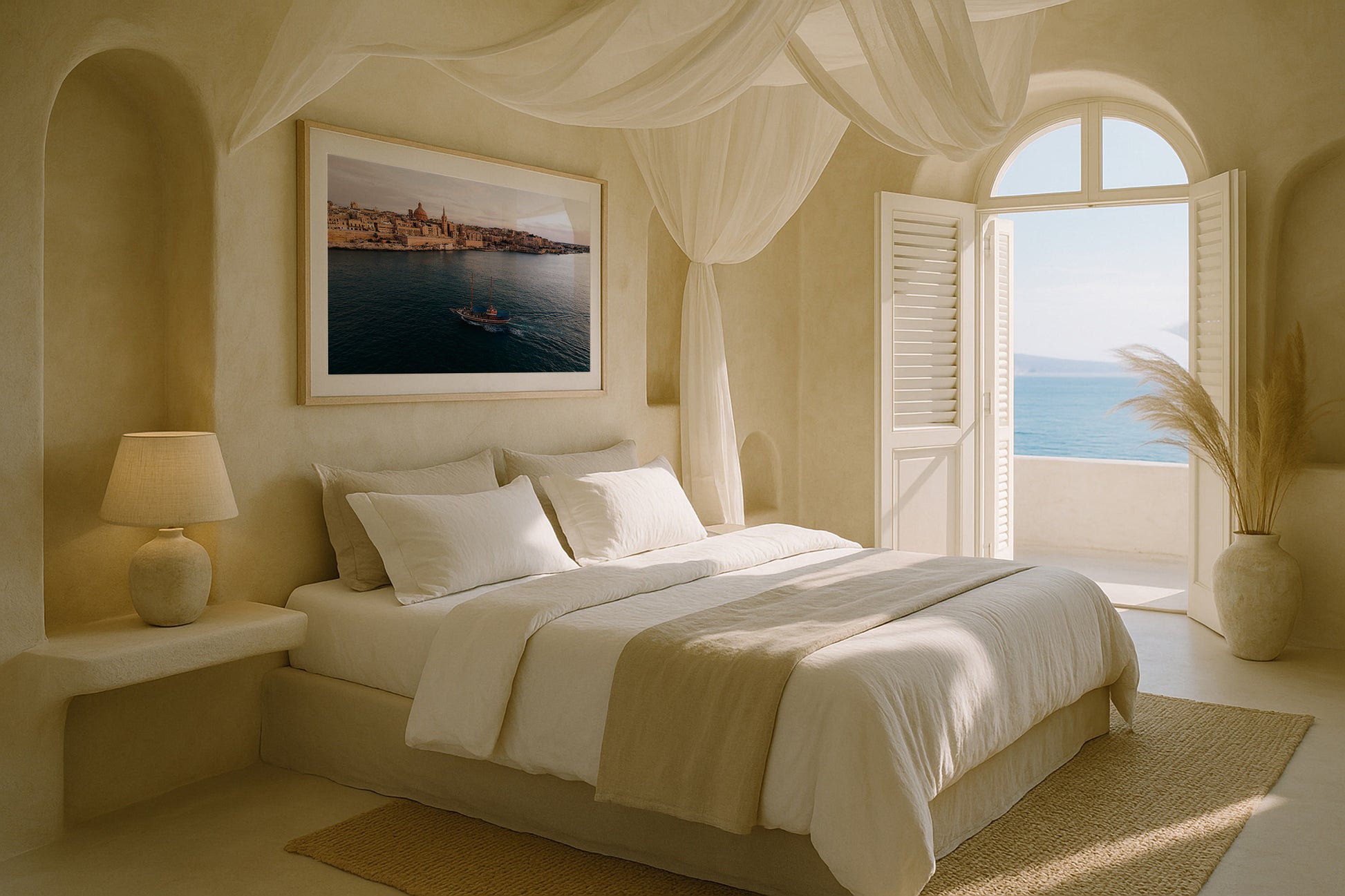 A classic Maltese schooner glides through the calm evening waters, framed against the historic skyline of Valletta. Shot just before sunset, this composition captures the spirit of Malta—where tradition meets timeless architecture.