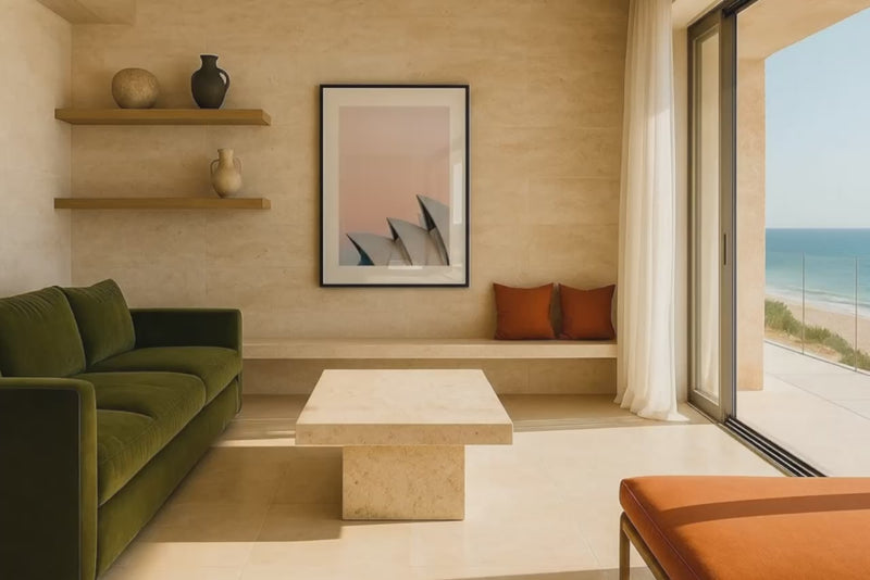 A fresh perspective on Australia’s most iconic landmark. This minimalistic print captures the Sydney Opera House silhouetted against a delicate pastel sky, bringing a sense of calm, elegance and structure into your space.