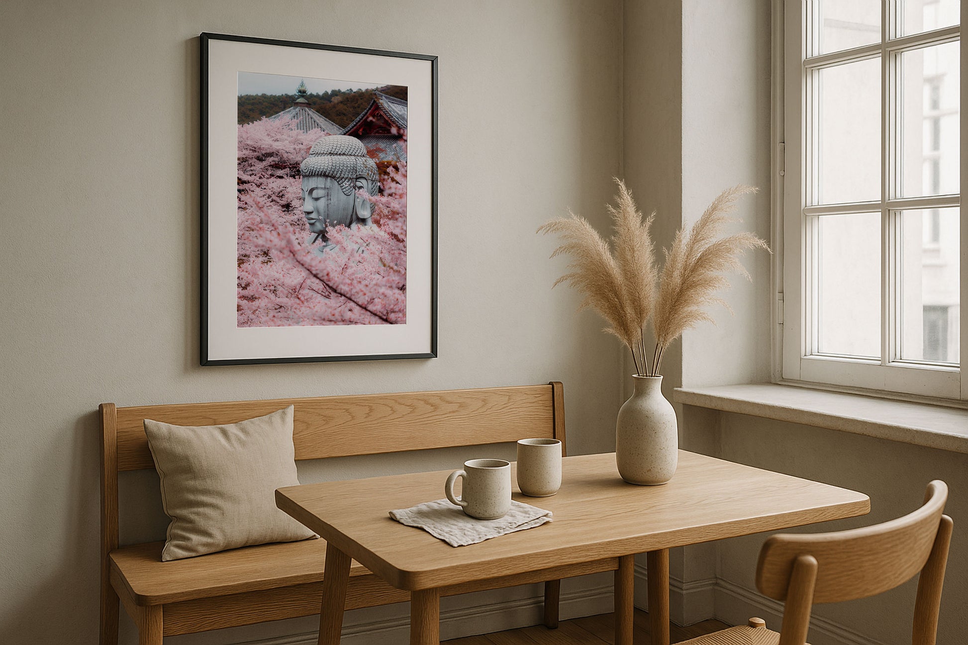 Immerse yourself in tranquility with Tsubosaka-dera Temple Sakura. This stunning original photo captures a serene buddha amidst a sea of delicate pink cherry blossoms. Let the calming energy of this artwork bring peace and inspiration to your space.